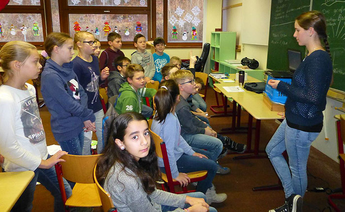 Interessante Thementage erlebten die SchülerInnen der Klassenstufe 5 klassenübergreifend mit pädagogischen und allgemeinbildenden Projekten. Das Bild zeigt eine Schülergruppe im Workshop „Cybermobbing“.