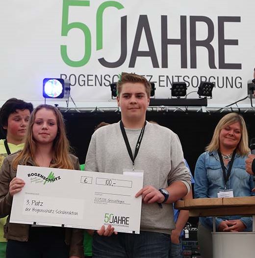 Am Sonntag, den 20.09.2015 war es dann endlich soweit: eine Jury der Firma Bogenschütz bewertete anlässlich des Firmenjubiläums zum 50. Geburtstag, die Container mehrerer Schulen. Die Realschüler des Schulverbundes erreichten dabei den 3. Platz mit einem Preisgeld von 100 €. Stephan Hartmaier und Yvonne Klein aus der Klasse 8b nahmen den Gutschein in Empfang. Unterstützt wurden sie mit tosendem Applaus von den Eltern, die Ihnen von den Bänken aus zujubelten.